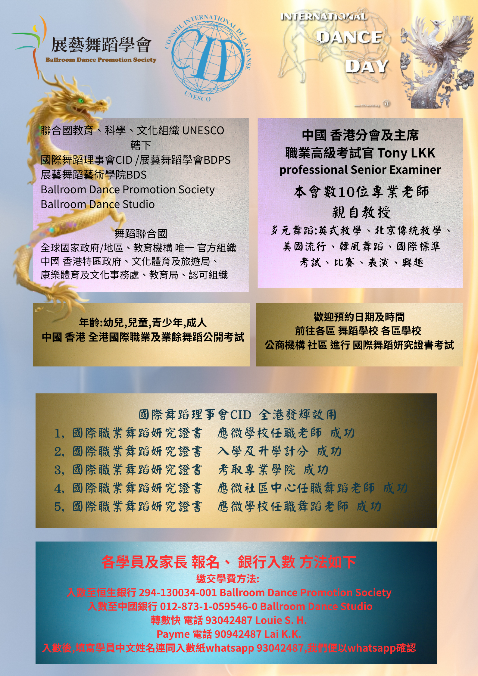 展藝舞蹈學會BDPS 學員邀交學費銀行資料及國際舞蹈理事會CID事項通告