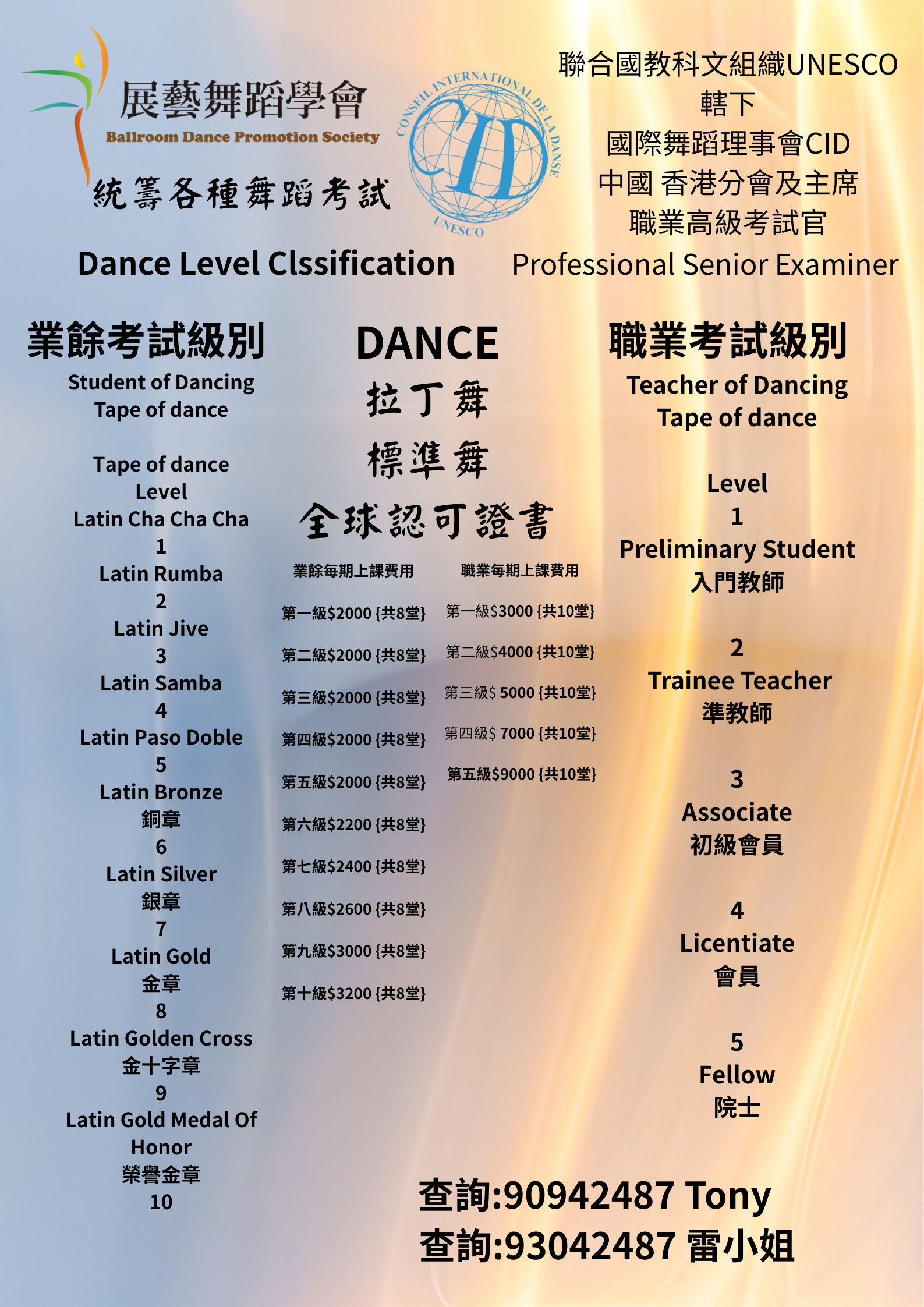 拉丁舞及標準舞 職業及業餘各種舞蹈 CID 國際證書課程,收費表