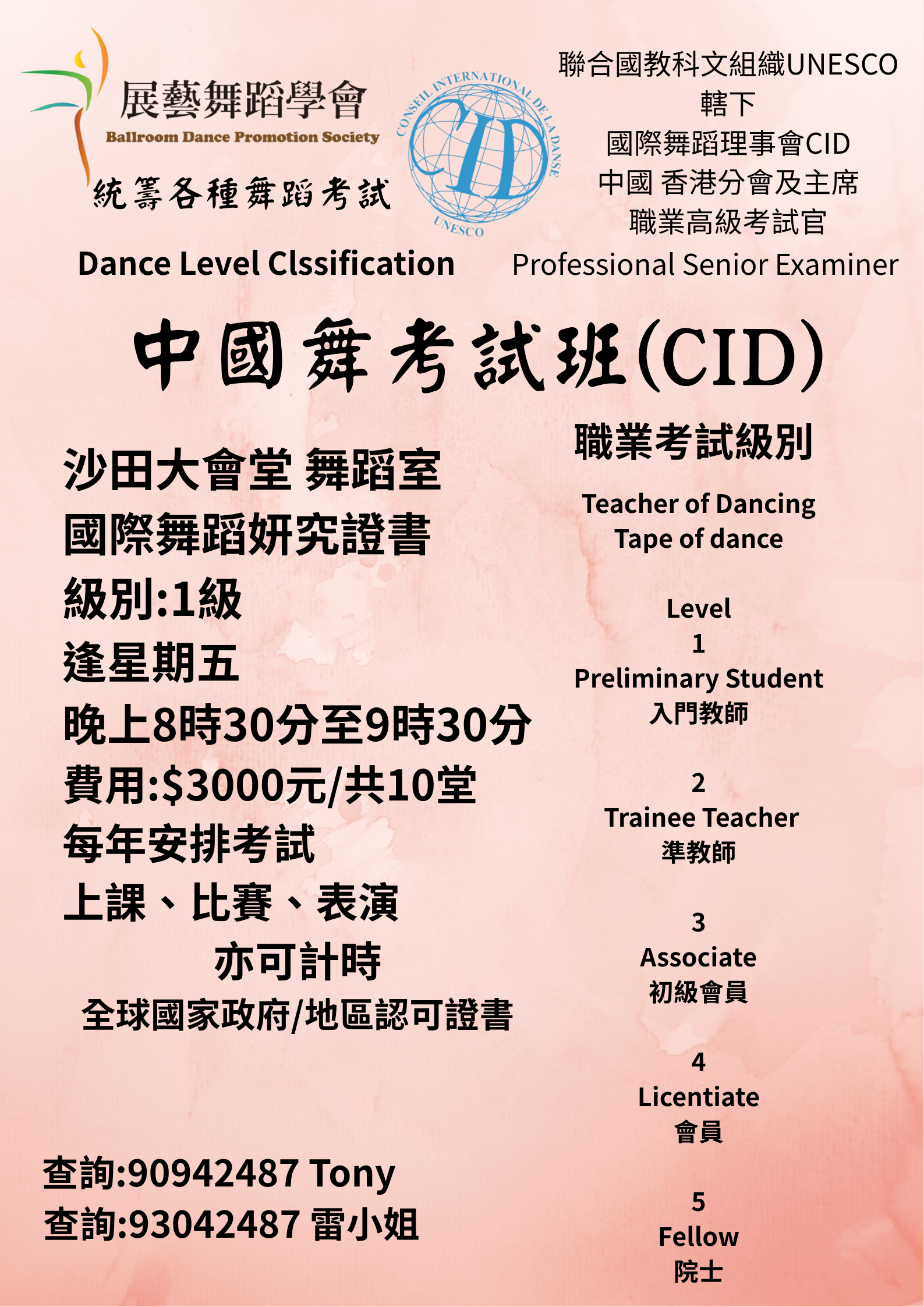 拉丁舞及標準舞 職業及業餘各種舞蹈 CID 國際證書課程,收費表