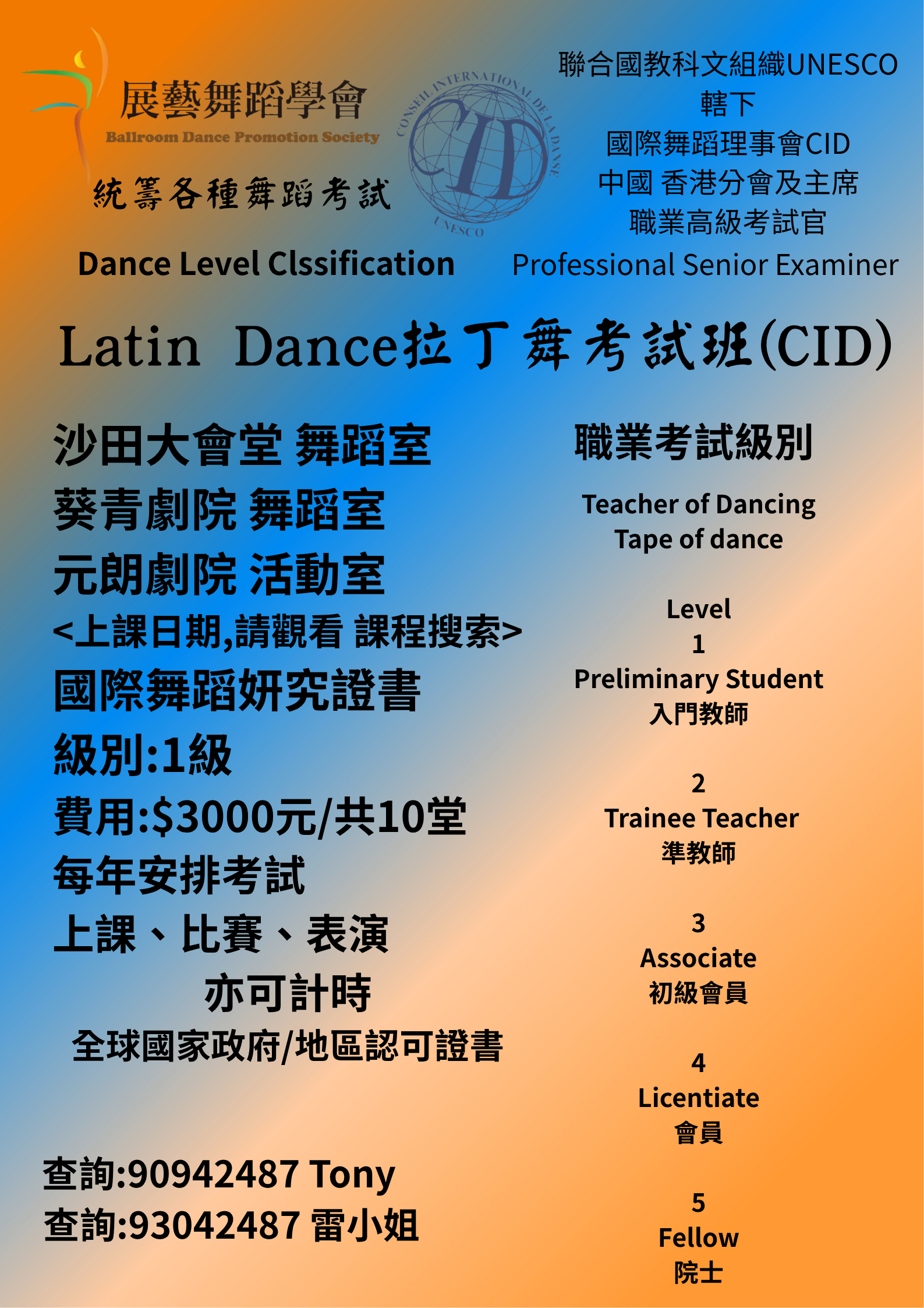 拉丁舞及標準舞 職業及業餘各種舞蹈 CID 國際證書課程,收費表