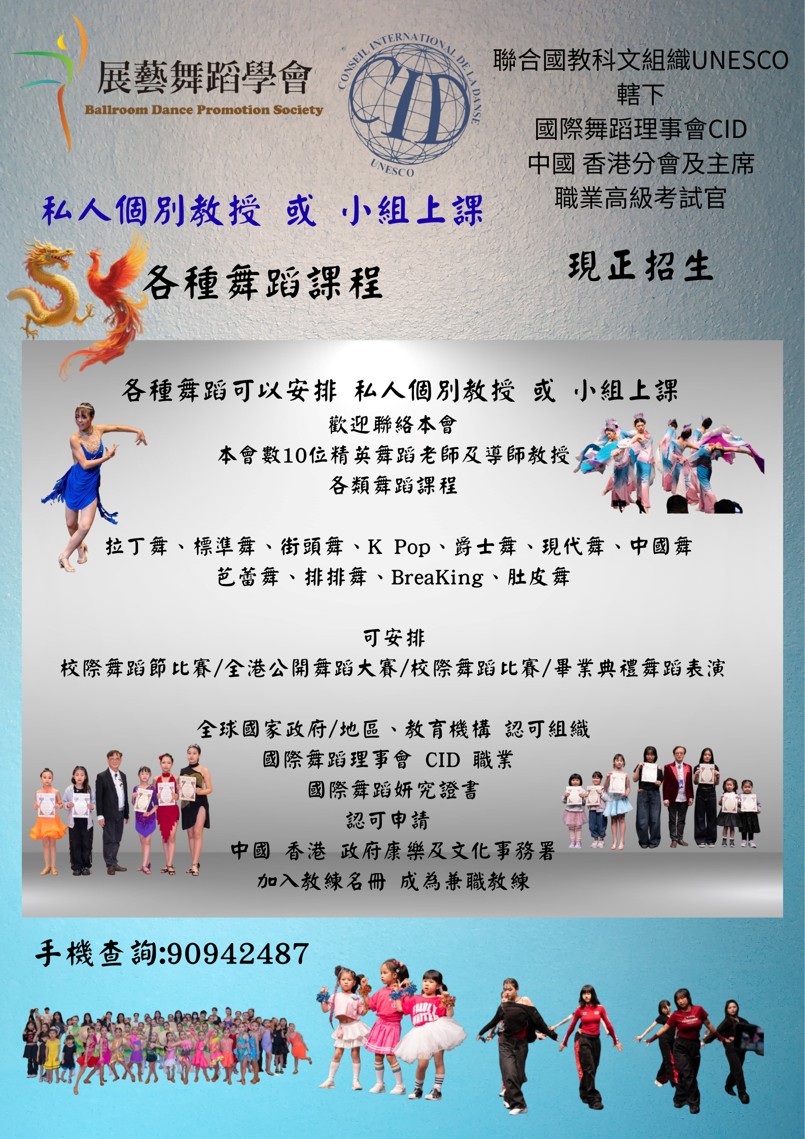 所有 展藝舞蹈學會BDPS 學員邀交學費銀行資料及國際舞蹈理事會CID事項通告 歡迎聯絡 私人個別 或 小組上課 沙田大會堂{舞蹈室} 各項舞蹈班招生 葵青劇院{舞蹈室} 各項舞蹈班招生 元朗劇院{活動室} 各項舞蹈班招生 元朗體育館 活動室 2026年 深水埗體育館 活動室 各項舞蹈班 現正招生 全港各區體育館 活動室 舞蹈班 拉丁舞及標準舞 職業及業餘各種舞蹈 CID 國際證書課程,收費表 職業及業餘各種舞蹈 CID 國際證書課程,收費表 Latin Dance 拉丁舞 國際舞蹈妍究證書課程(CID)職業 Latin Dance 拉丁舞 國際舞蹈妍究證書課程(CID)1-10級 Ballroom Dance 標準舞 國際舞蹈妍究證書課程(CID)職業 Ballroom Dance 標準舞 國際舞蹈妍究證書課程(CID)1-10級 中國舞 國際舞蹈妍究證書課程(CID)職業 中國舞 國際舞蹈妍究證書課程 CID1-10級 芭蕾舞 國際舞蹈妍究證書課程(CID)職業 芭蕾舞 國際舞蹈妍究證書課程(CID)1-10級 Hip Hop 國際舞蹈妍究證書課程(CID)職業 Hip Hop 國際舞蹈妍究證書課程(CID)1-10級 K Pop 國際舞蹈妍究證書課程(CID)職業 K Pop 國際舞蹈妍究證書課程(CID)1-10級 Jazz Dance 國際舞蹈妍究證書課程(CID)職業 Jazz Dance 國際舞蹈妍究證書課程(CID)1-10級 Line Dance(排排舞) 國際舞蹈妍究證書課程(CID)職業 Line Dance(排排舞) 國際舞蹈妍究證書課程(CID)1-10級 BreaKing 國際舞蹈妍究證書課程(CID)職業 BreaKing 國際舞蹈妍究證書課程(CID)1-10級 誠接 幼稚園/小學/中學/大學 / 公商機構/政府部門,開辦舞蹈課程或舞蹈考試課程 誠接 舞蹈表演 沙田大會堂,葵青劇院,元朗劇院,深水埗體育館 2025暑期舞蹈班/各區舞蹈班 現正招生